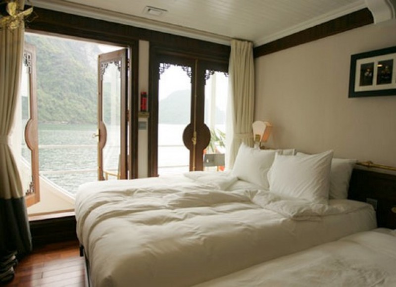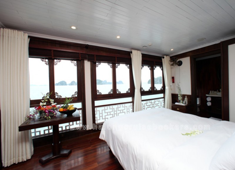 13.00: Let the vacation begin with a delicious lunch as the boat cruises toward South East Ha Long Bay passing by Kissing rock, Finger Islet, Toad Islet…