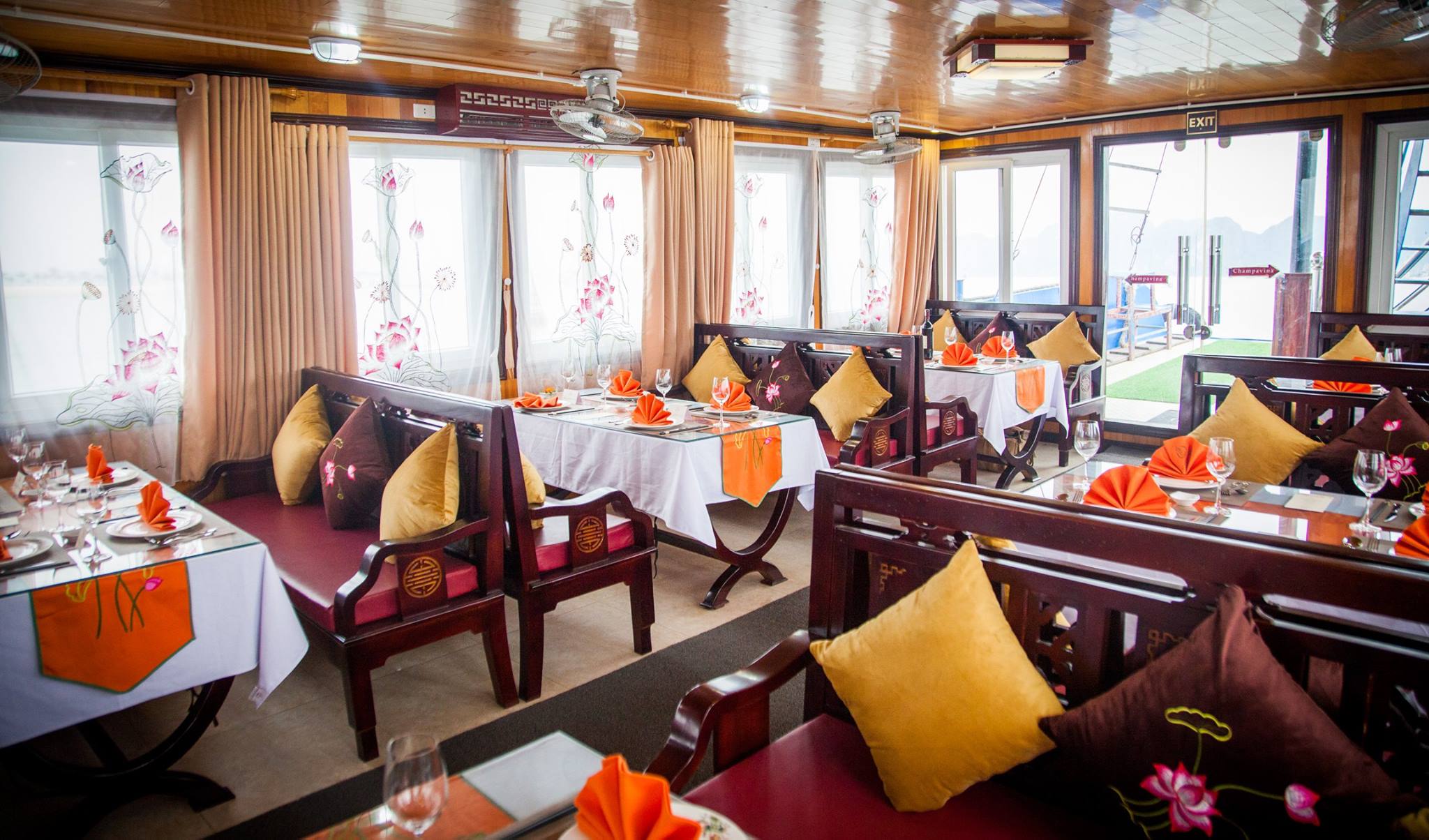 12.30:     Lunch is served with Vietnamese traditional specialties while cruising towards  Hoa Cuong area. Along the way, enjoy extraordinary scenery of thousands of limestone islands and islets in Ha Long Bay such as: Dog Rock, Duck Rock, Fighting Cock Rock, Lu Huong Islet. Camera should be well prepared to take amazing pictures at these places.